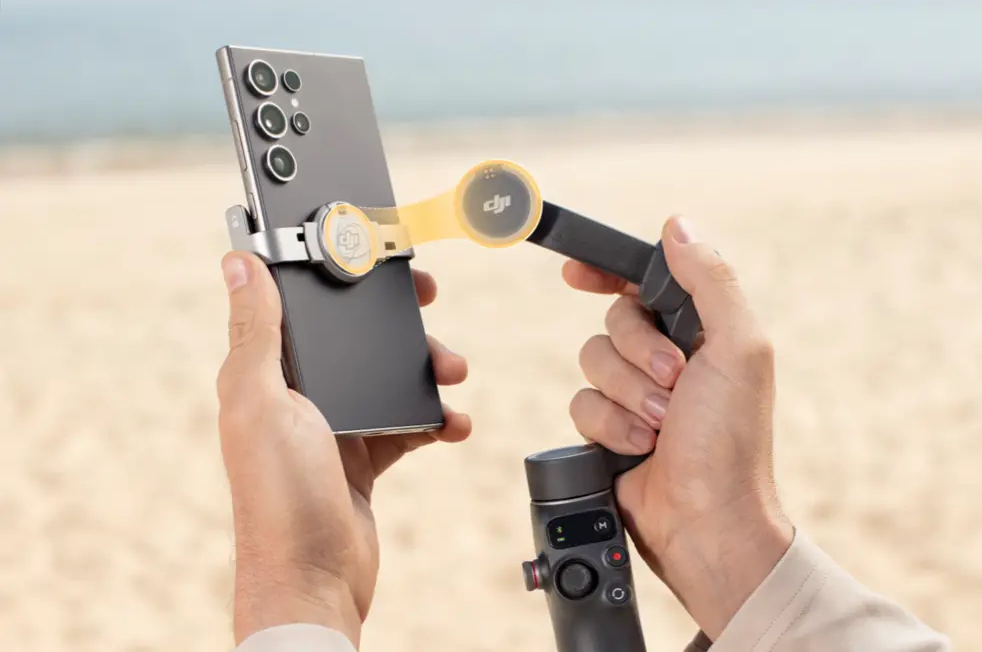 Разложите стабилизатор, чтобы включить его. Легко закрепите сопряженный телефон с помощью магнитной конструкции, и DJI Mimo автоматически выдвинется[4] для быстрой съемки.
